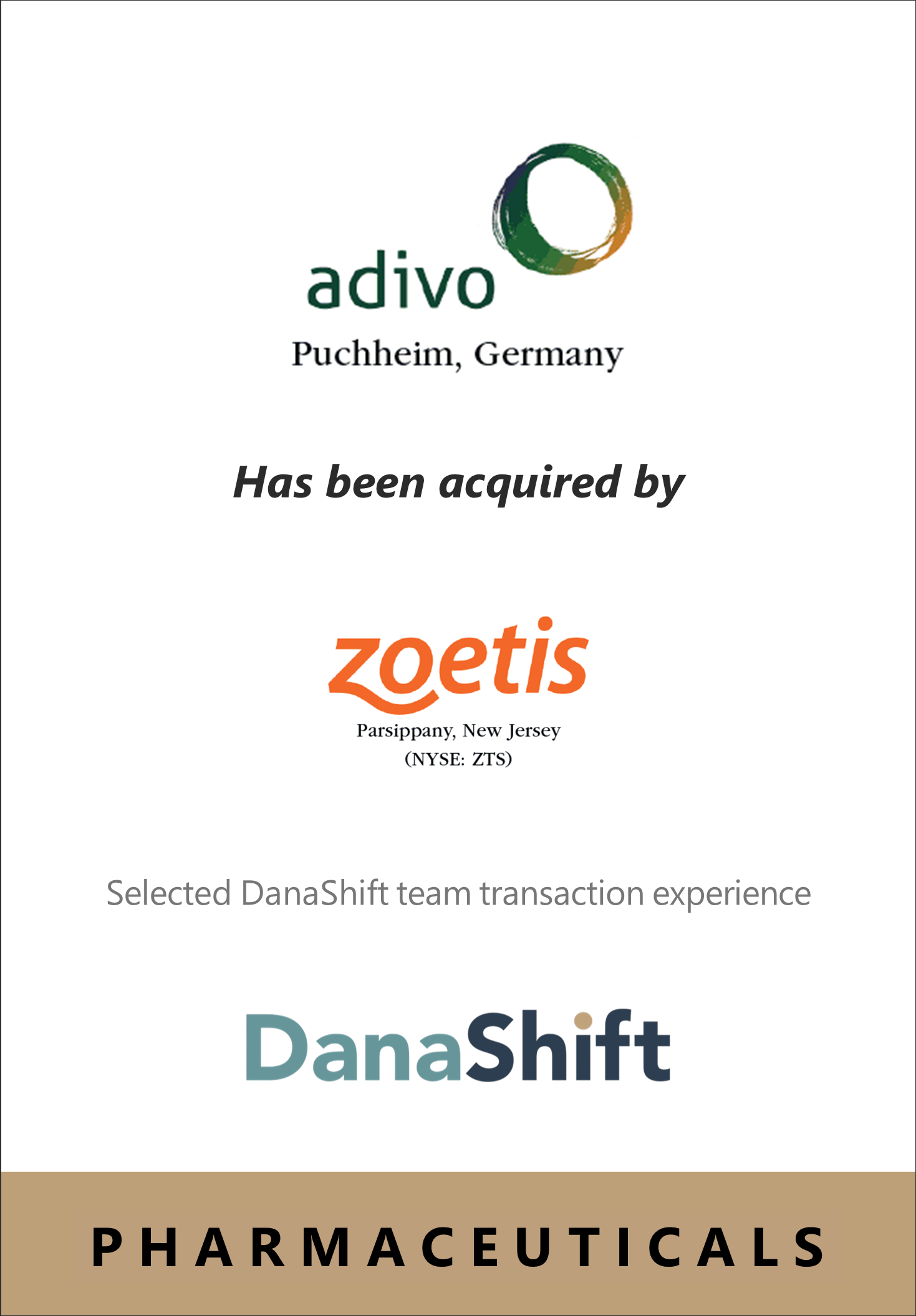 DanaShift supported Adivo’s management, board, and shareholders in achieving liquidity through its transaction with Zoetis. The engagement reflected the value of pairing category-specific innovation with access to the right strategic acquirer — one capable of accelerating the reach and impact of the company’s monoclonal antibody platform in companion animal health. The transaction illustrated a DanaShift hallmark: helping clients realize value while preserving the vision behind the business.